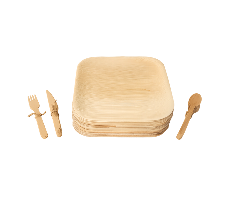 Party pack of eco-friendly square plates and cutlery – Ideal for weddings, parties, corporate and catering events.